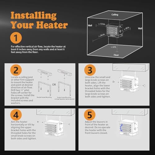 Tailor airflow direction with adjustable louvers and a variable tilt angle. Whether directing heat to a specific spot or achieving even warmth throughout your workspace, this garage heater provides the flexibility needed to meet your preferences.